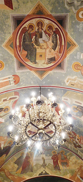 Le Pantocrator (Christ tout-puissant) entouré des quatre évangélistes et la Sainte Trinité avec quatre mélodes règnent sur la chapelle.